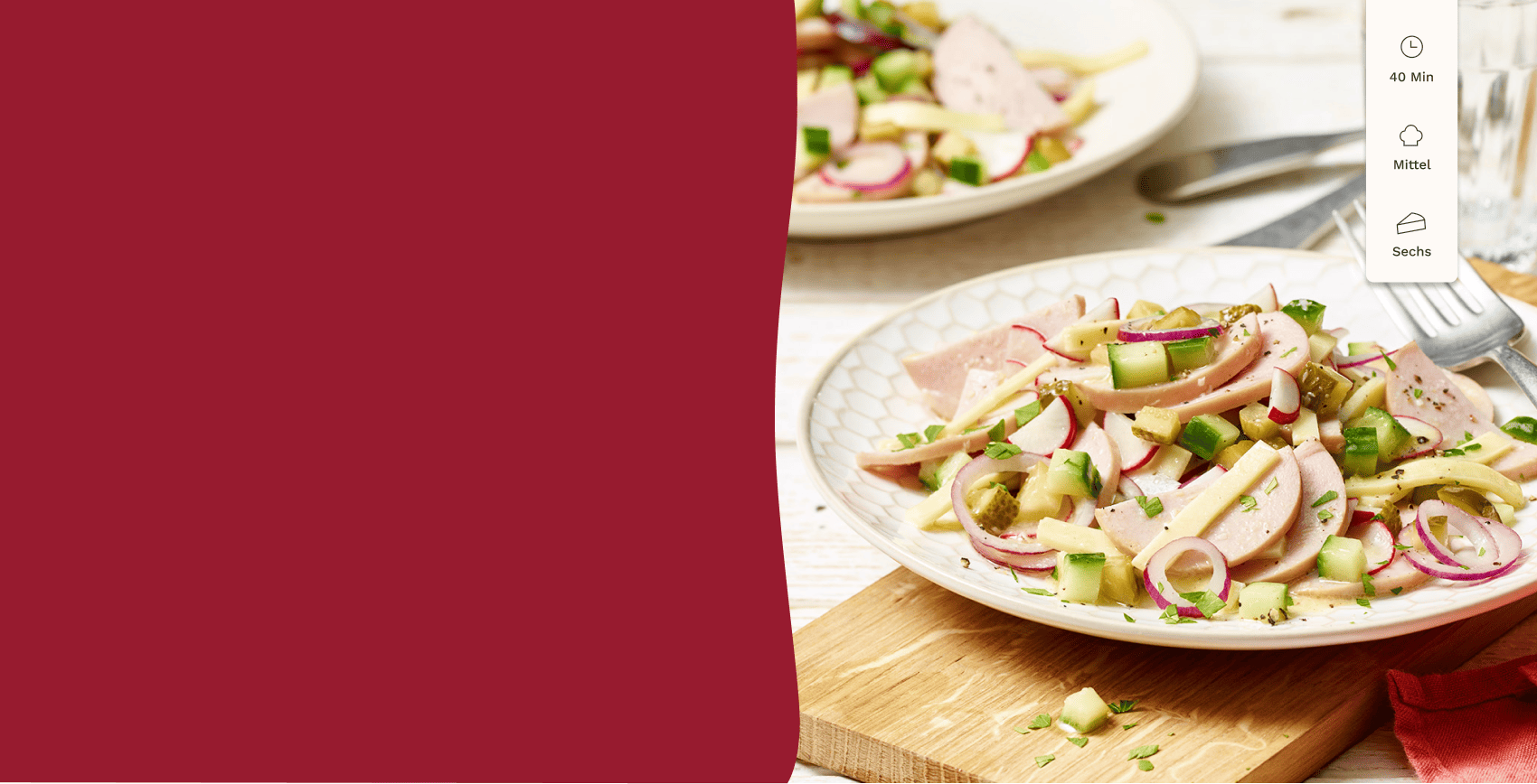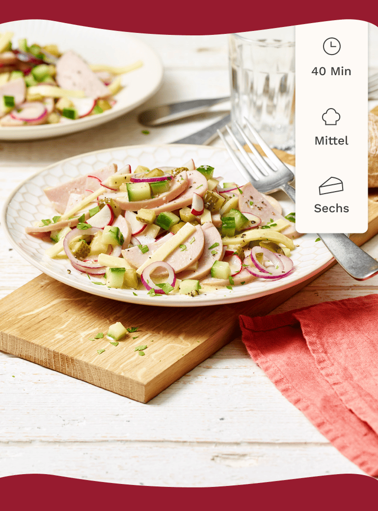 Frische Radieschen und Gurken treffen auf würzigen Bergkäse und unsere Herta Fleischwurst: So schmeckt Fleischwurstsalat auf die leichte Art. Zubereitet für 6 Personen und abgerundet mit aromatischen Kräutern ist der Salat ein Genuss für die ganze Familie.
