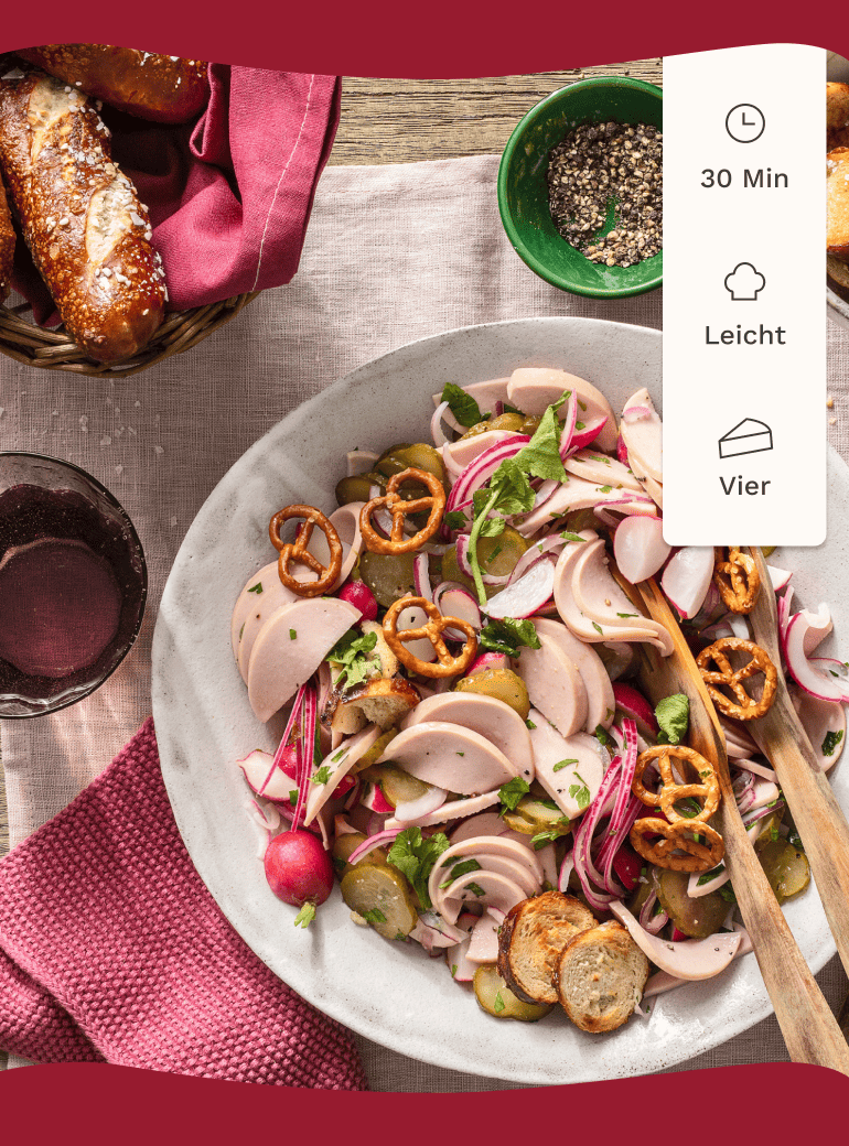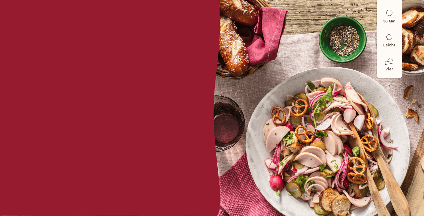 Lust auf einen deftigen Snack oder lieber Salat? Dieses Gericht kann beides und überrascht mit knusprigen Laugencrackern, knackigen Radieschen und unserer würzigen Herta Fleischwurst über Buchenholz geräuchert. Ein Klassiker neu interpretiert!