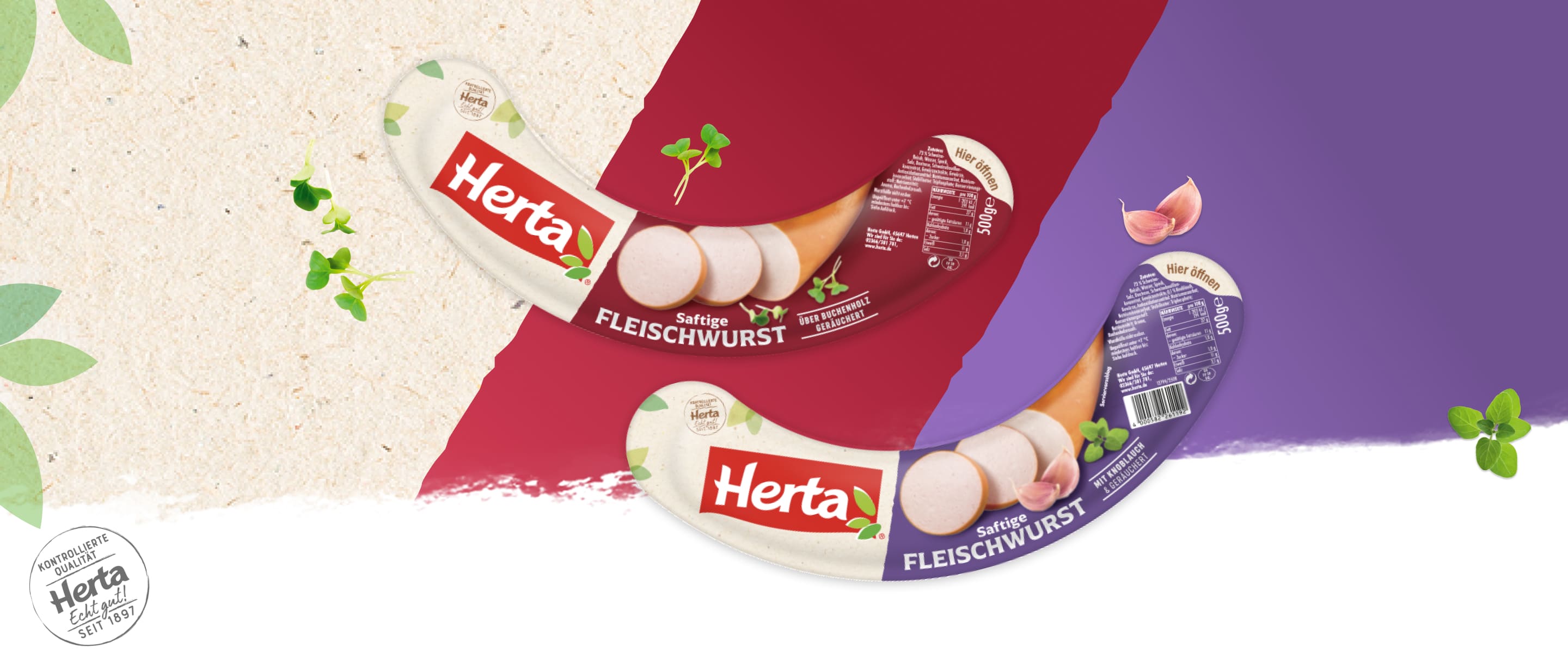 Die Saftige Fleischwurst von Herta kommt demnächst in einem ruhigen, übersichtlichen Look daher. Er ist geprägt vom großen Herta Logo, einer appetitlichen Produktabbildung, einer deutlichen Schriftart und je nach Sorte einer dunkelroten oder violetten Hintergrundfarbe. Auch das bekannte Herta Qualitätssiegel mit dem Verweis auf die fast 130-jährige Tradition des Hertener Unternehmens findet sich auf den Klassikern wieder.